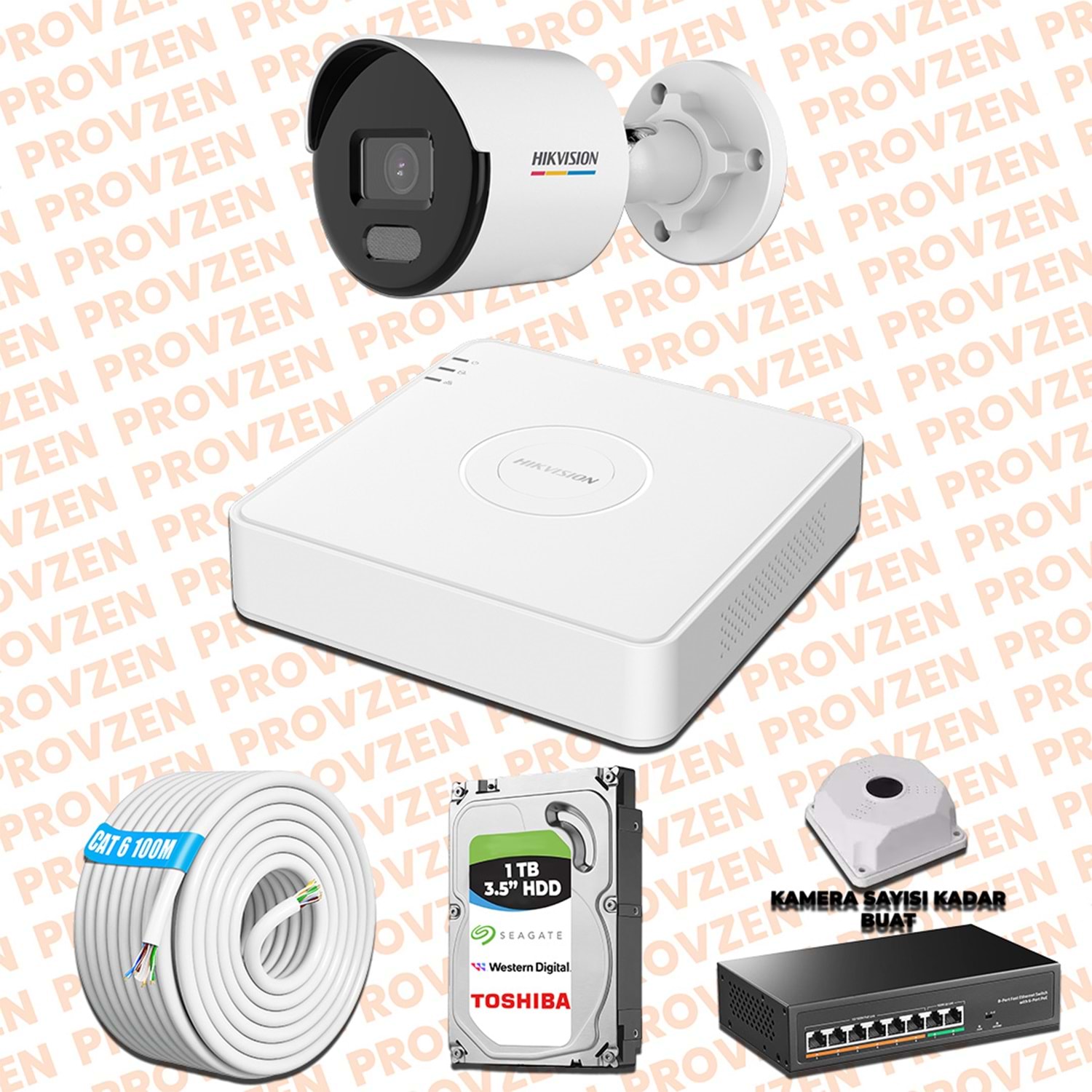 PROVZEN HİKVİSİON KAMERA SETİ, 1440P çözünürlüğe sahip, 1TB(1000GB) HDD depolama alanıyla ve gece görüşlü bir set.