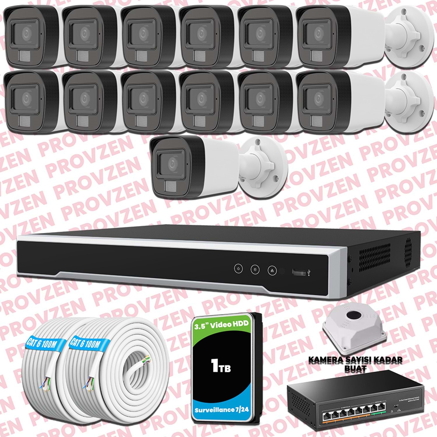 PROVZEN HİKVİSİON KAMERA SETİ, 1080P çözünürlüğe sahip, 1TB(1000GB) HDD depolama alanıyla ve gece görüşlü bir set.