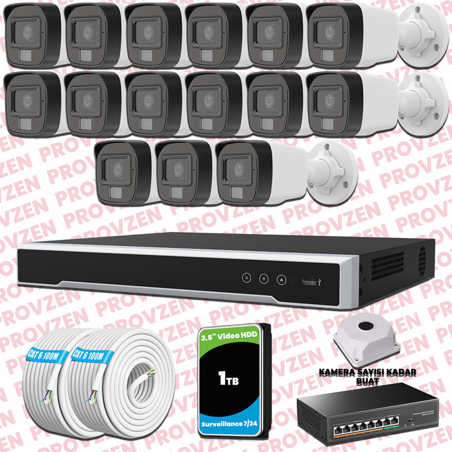 PROVZEN HİKVİSİON KAMERA SETİ, 1080P çözünürlüğe sahip, 1TB(1000GB) HDD depolama alanıyla ve gece görüşlü bir set.