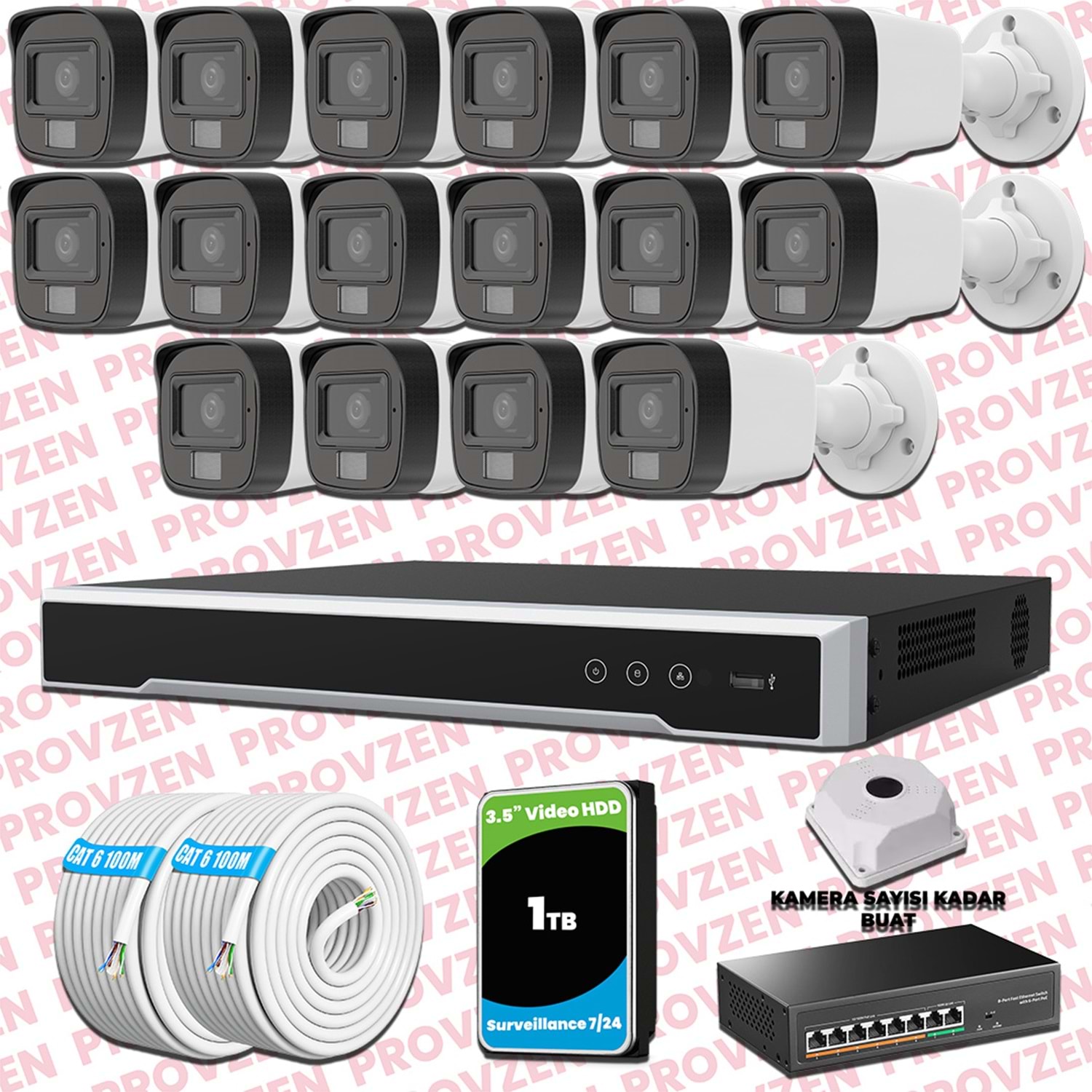 PROVZEN HİKVİSİON KAMERA SETİ, 1080P çözünürlüğe sahip, 1TB(1000GB) HDD depolama alanıyla ve gece görüşlü bir set.