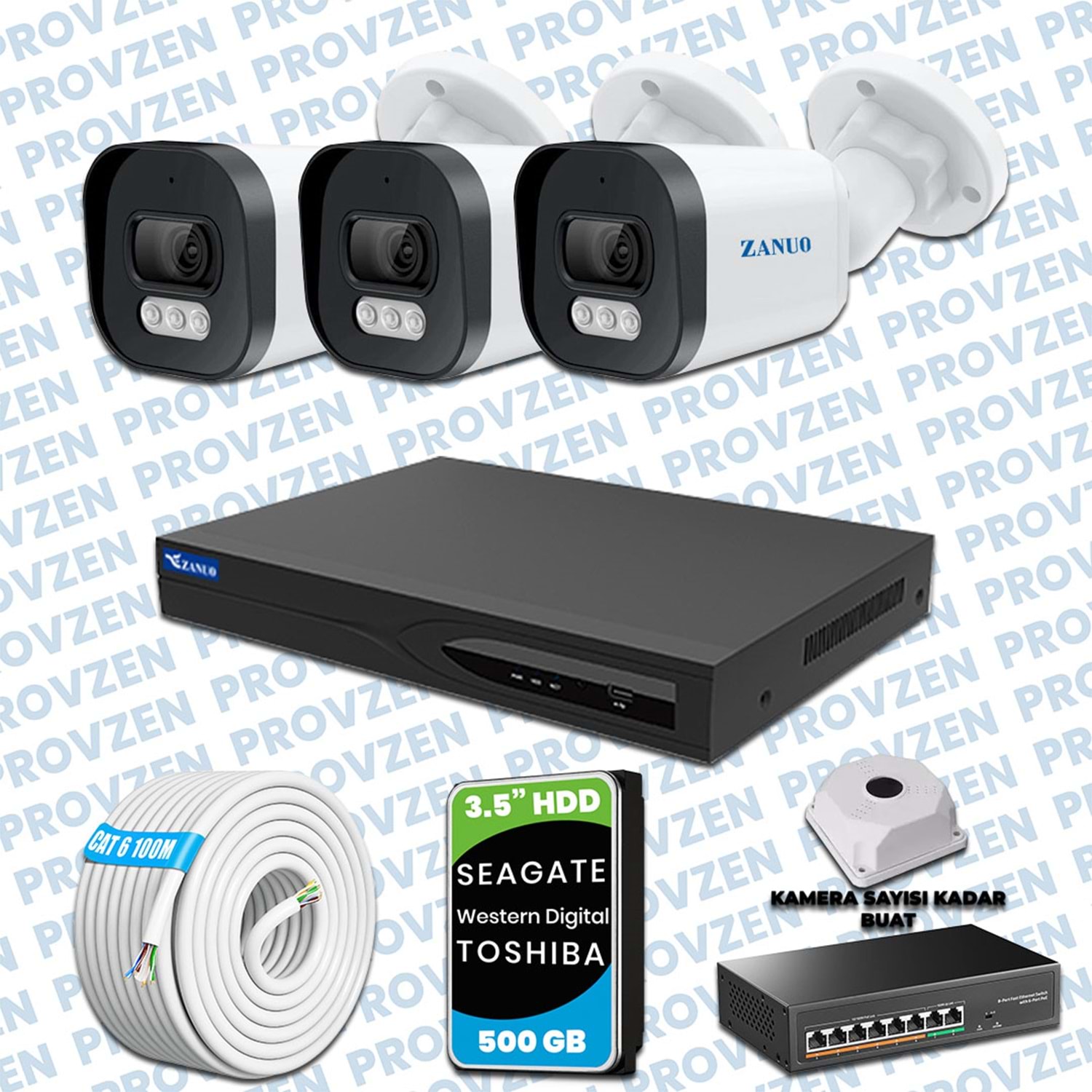 PROVZEN ZANUO KAMERA SETİ, 1080P çözünürlüğe sahip, 500GB HDD depolama alanıyla ve gece görüşlü bir set.