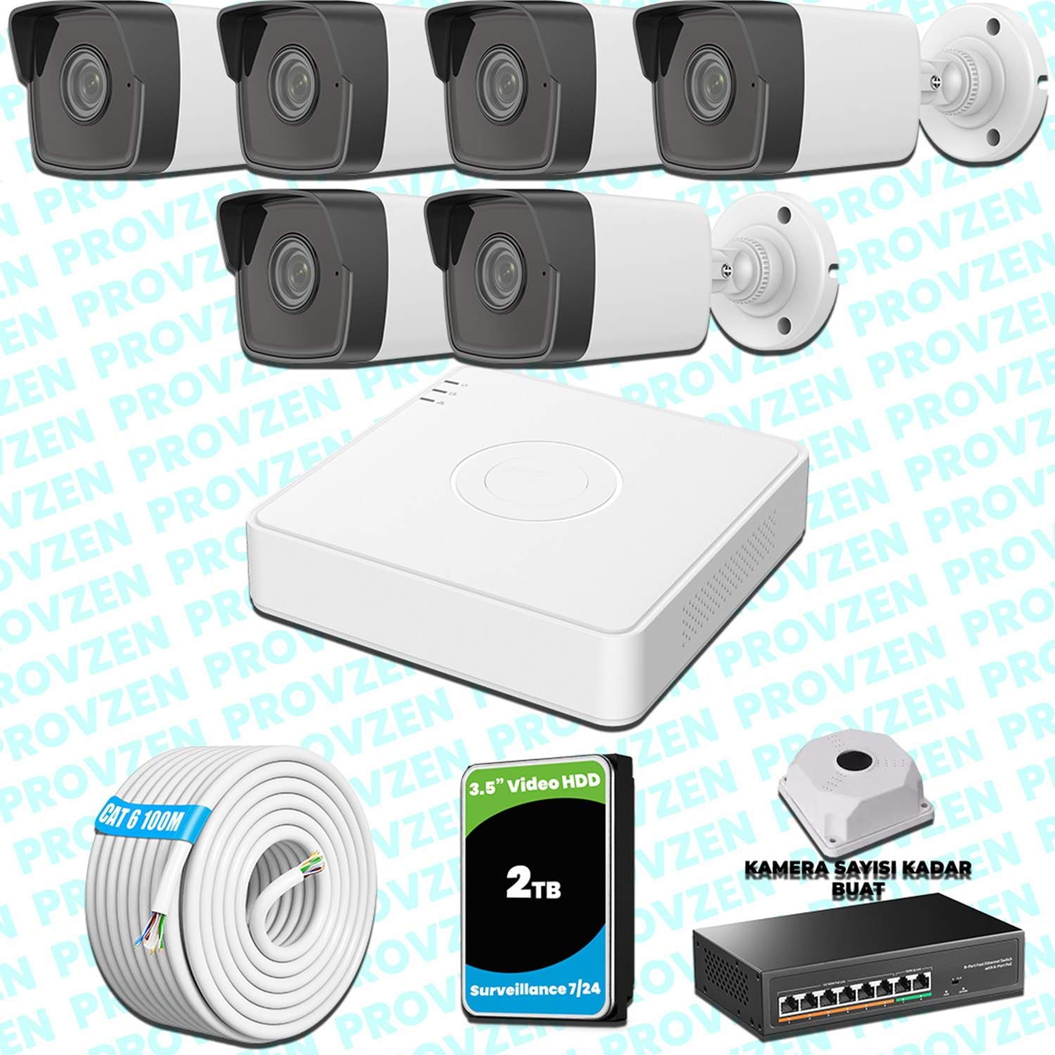 PROVZEN HİKVİSİON KAMERA SETİ, 1440P çözünürlüğe sahip, 2TB(2000GB) HDD depolama alanıyla ve gece görüşlü bir set.