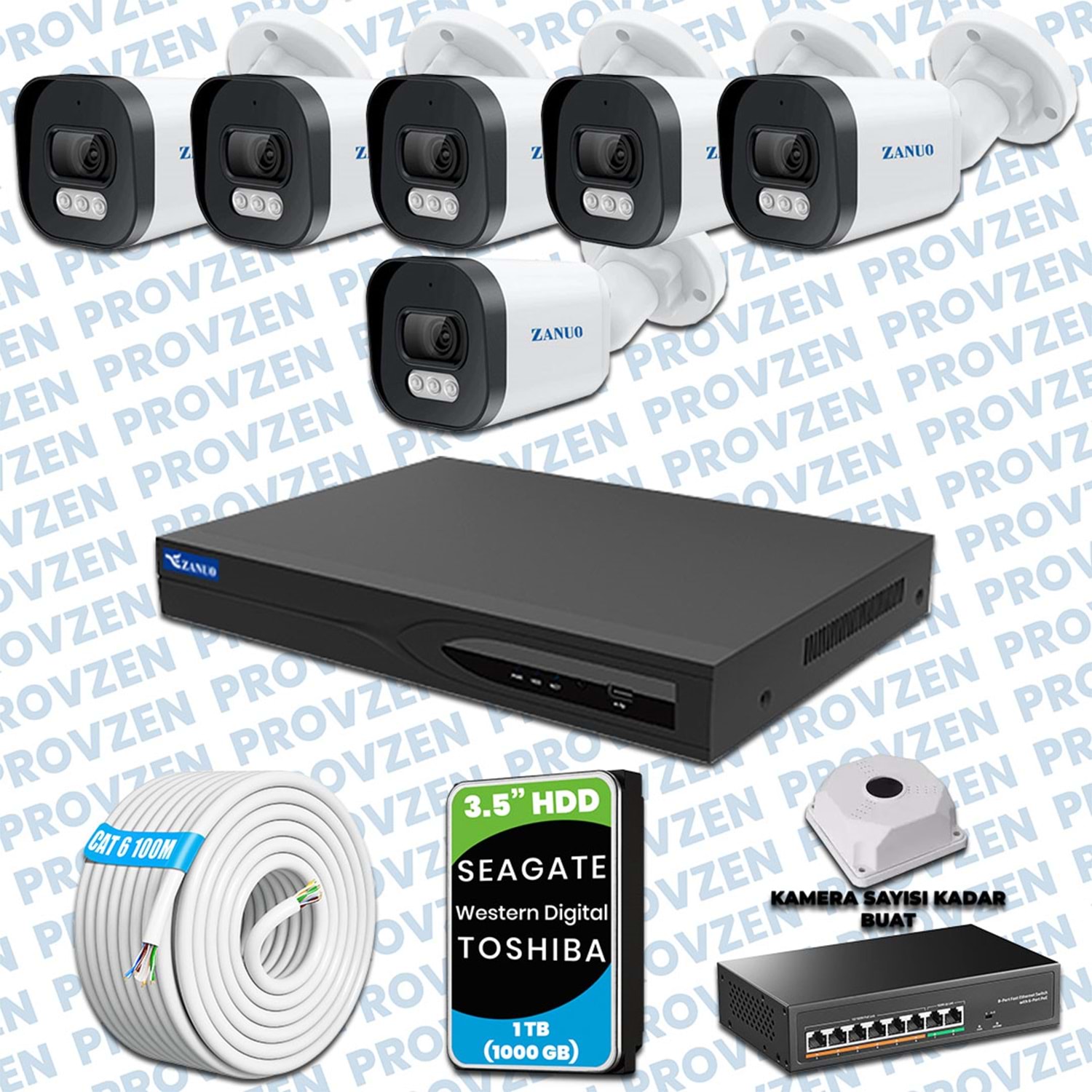 PROVZEN ZANUO KAMERA SETİ, 1080P çözünürlüğe sahip, 1TB(1000GB) HDD depolama alanıyla ve gece görüşlü bir set.